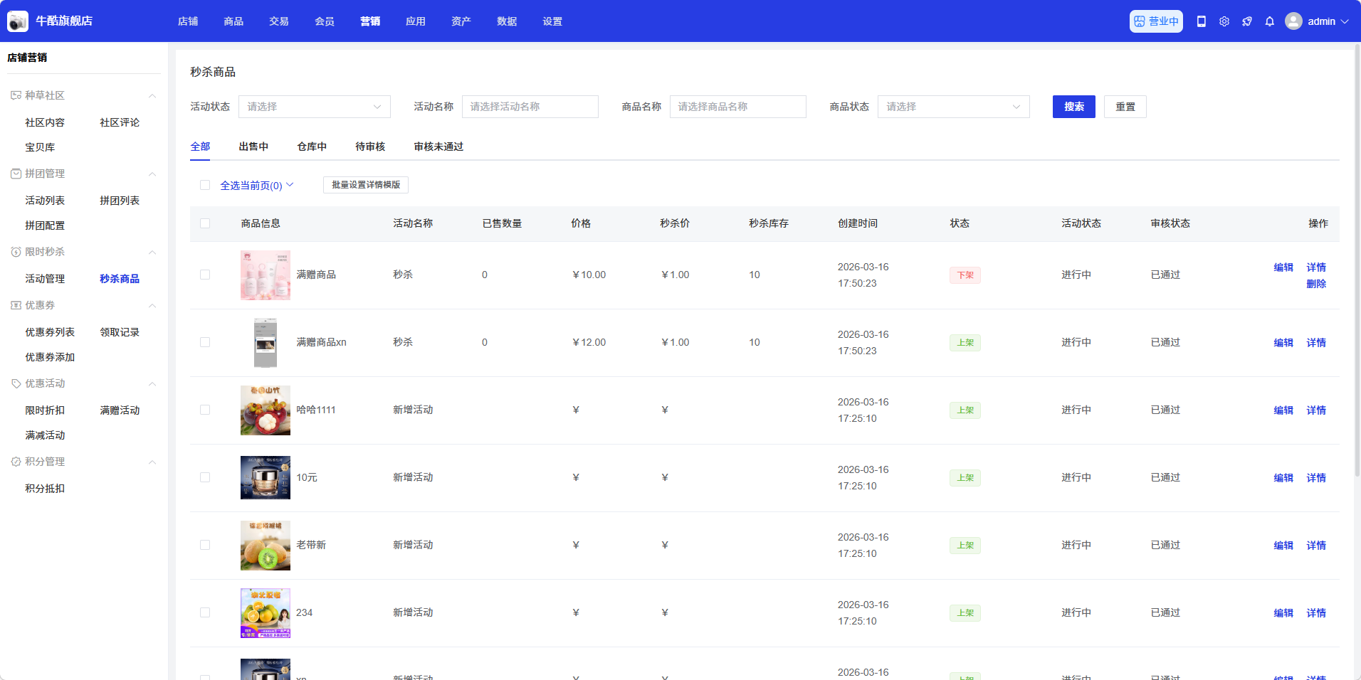 秒杀商品页面用于管理限时秒杀活动的商品,商家可以在此编辑、上下架、查看秒杀商品。
