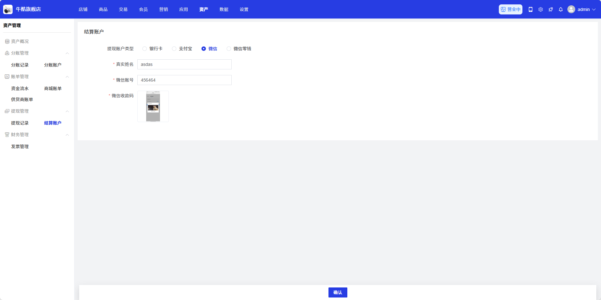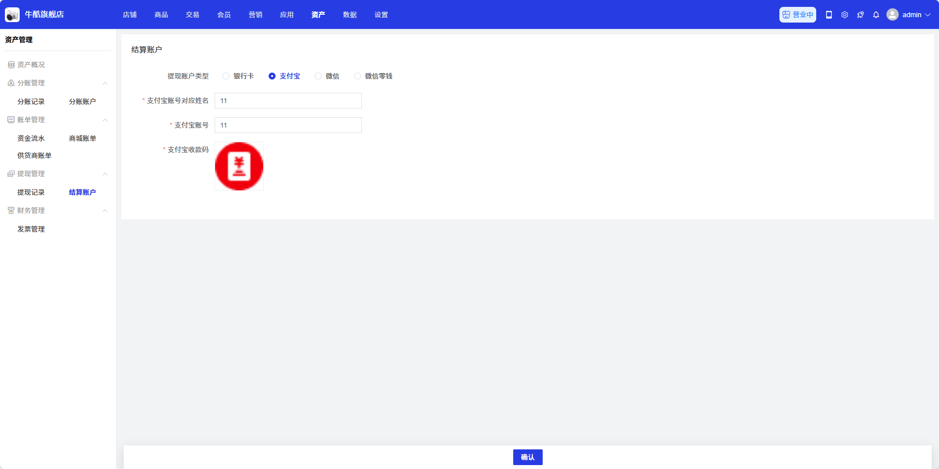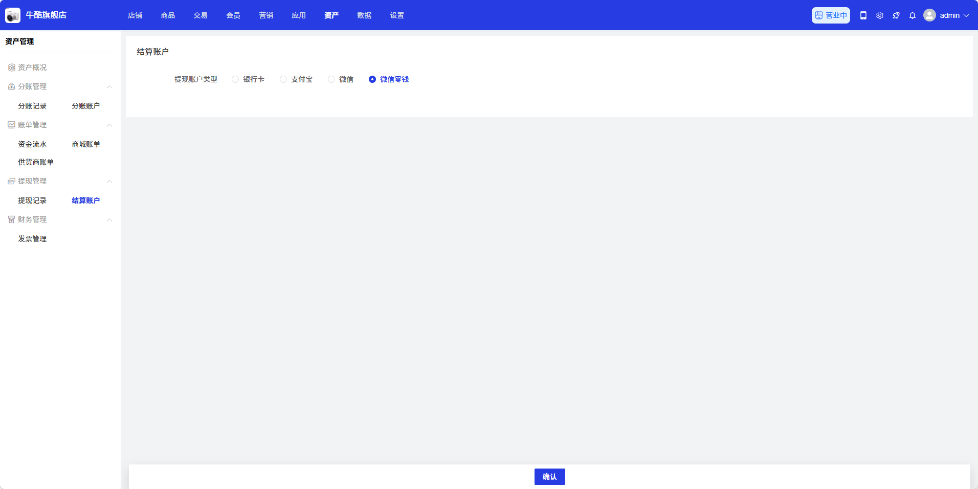 结算账户页面用于设置提现账户信息,商家可以在此设置提现账户类型,如银行卡、支付宝、微信、微信零钱等。通过结算账户管理,商家可以确保提现资金正常到账。
