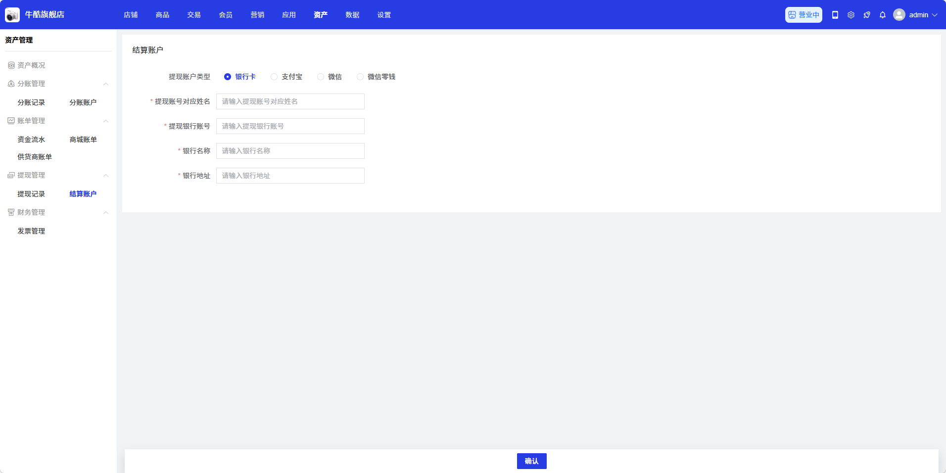 填写完成后,点击页面底部的「确认」按钮保存结算账户设置。