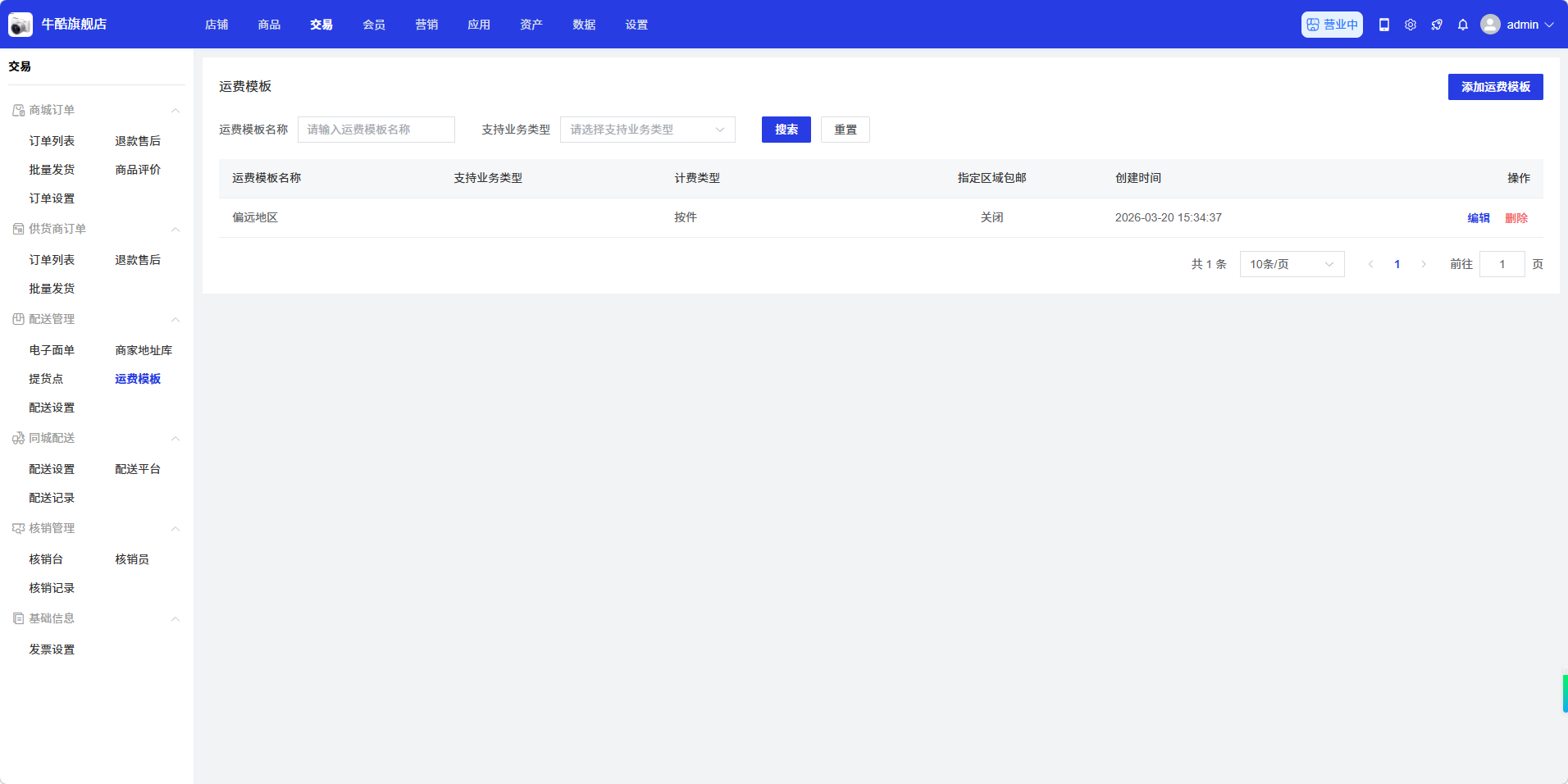 运费模板页面用于管理商品的运费规则,供货商可以在此添加、编辑、删除运费模板,设置不同地区的运费标准。通过运费模板管理,供货商可以根据不同地区和商品重量/体积设置合理的运费规则,提高物流成本控制。