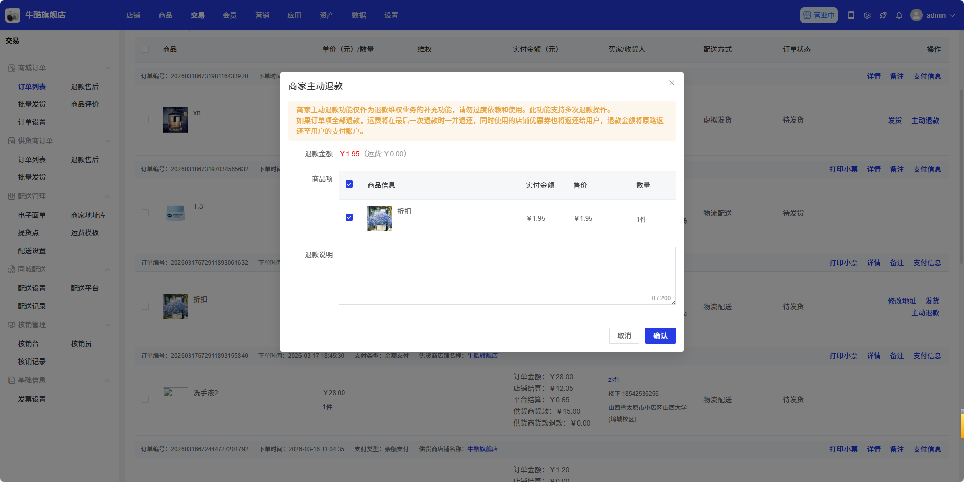 在订单列表中,找到需要退款的订单,点击操作列中的「主动退款」按钮,弹出商家主动退款对话框: