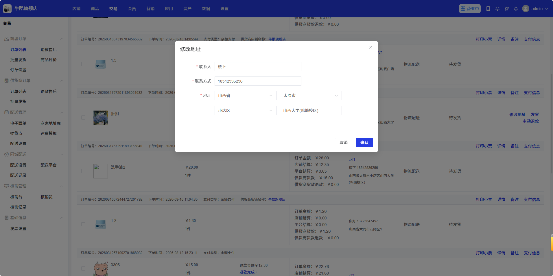 在订单列表中,找到需要修改收货地址的订单,点击操作列中的「修改地址」按钮,弹出修改地址对话框:
