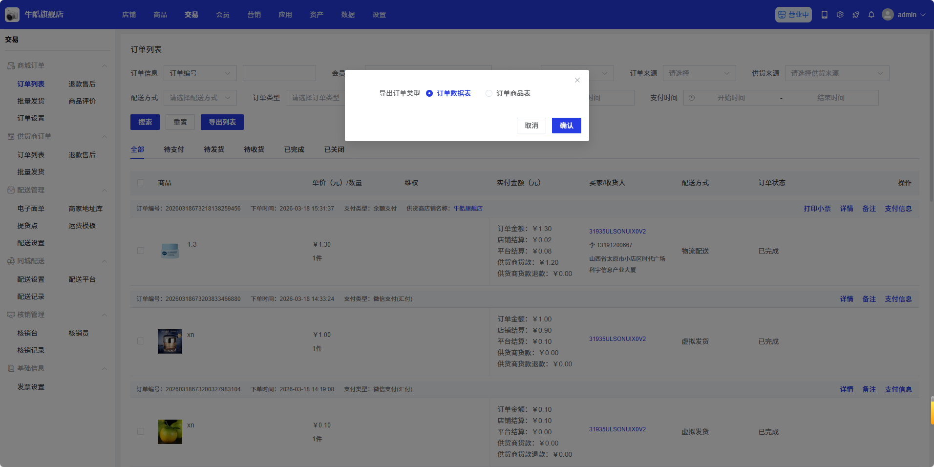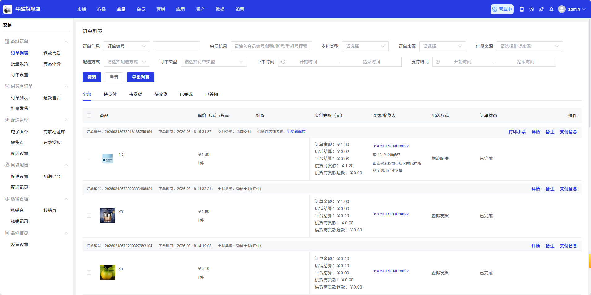 订单列表页面是商城管理订单的核心界面,用于查看、管理和操作所有订单。通过此页面,商城可以搜索订单、查看订单详情、修改订单信息、进行订单发货、主动退款等操作。