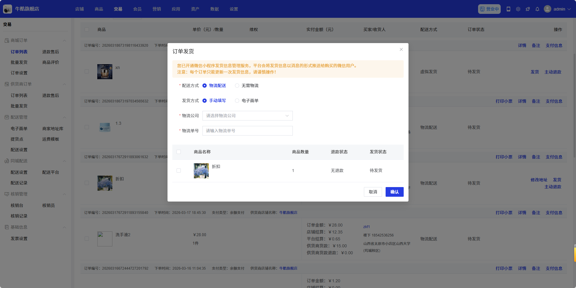 设置完成后,点击「确认」按钮完成发货,点击「取消」按钮取消操作。