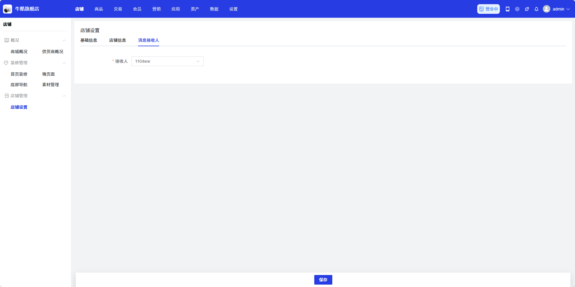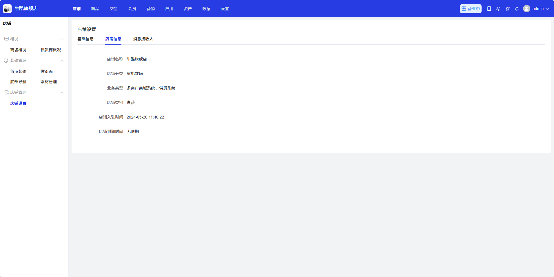 - 进入店铺设置页面,您可以看到基础信息、店铺信息、消息接收人等标签页