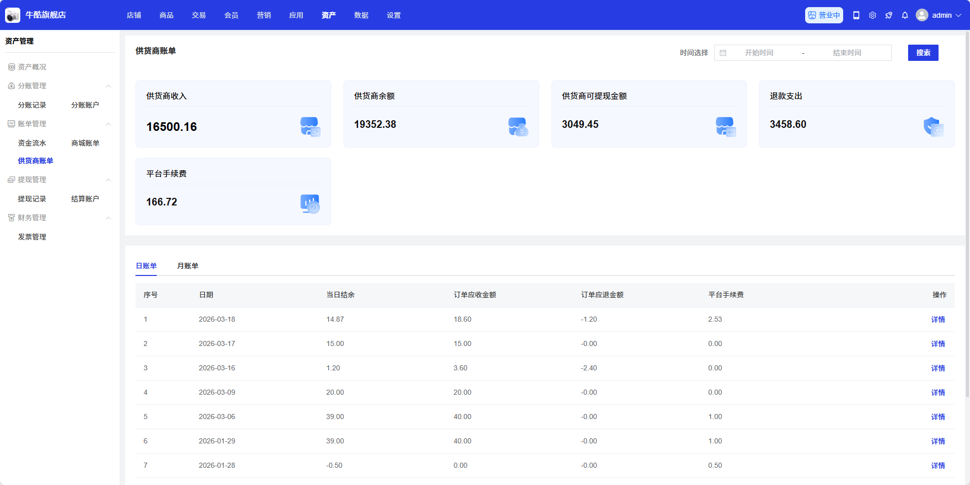在供货商账单列表中,找到需要查看的账单,点击操作列中的「详情」按钮,查看账单的详细信息