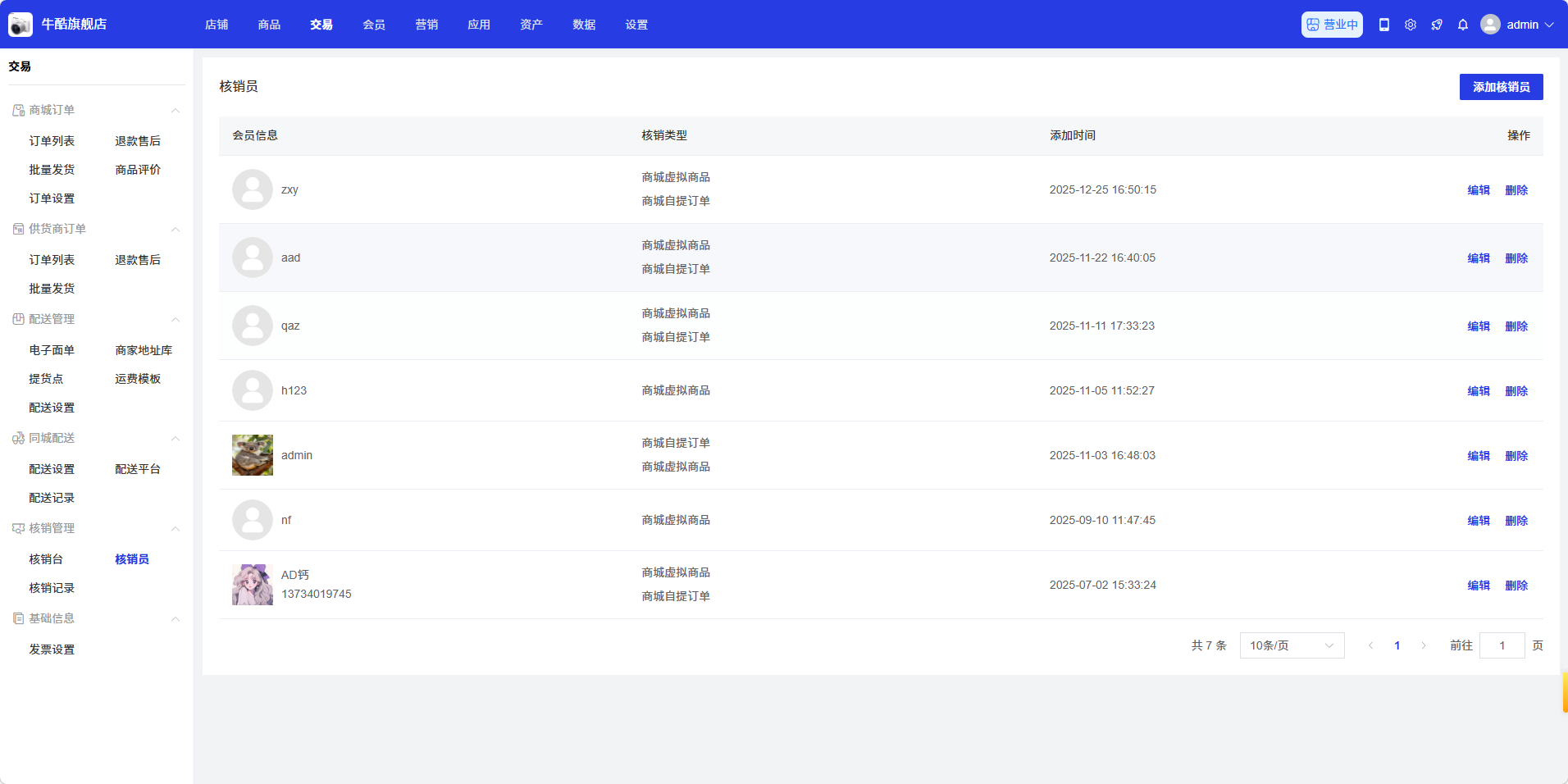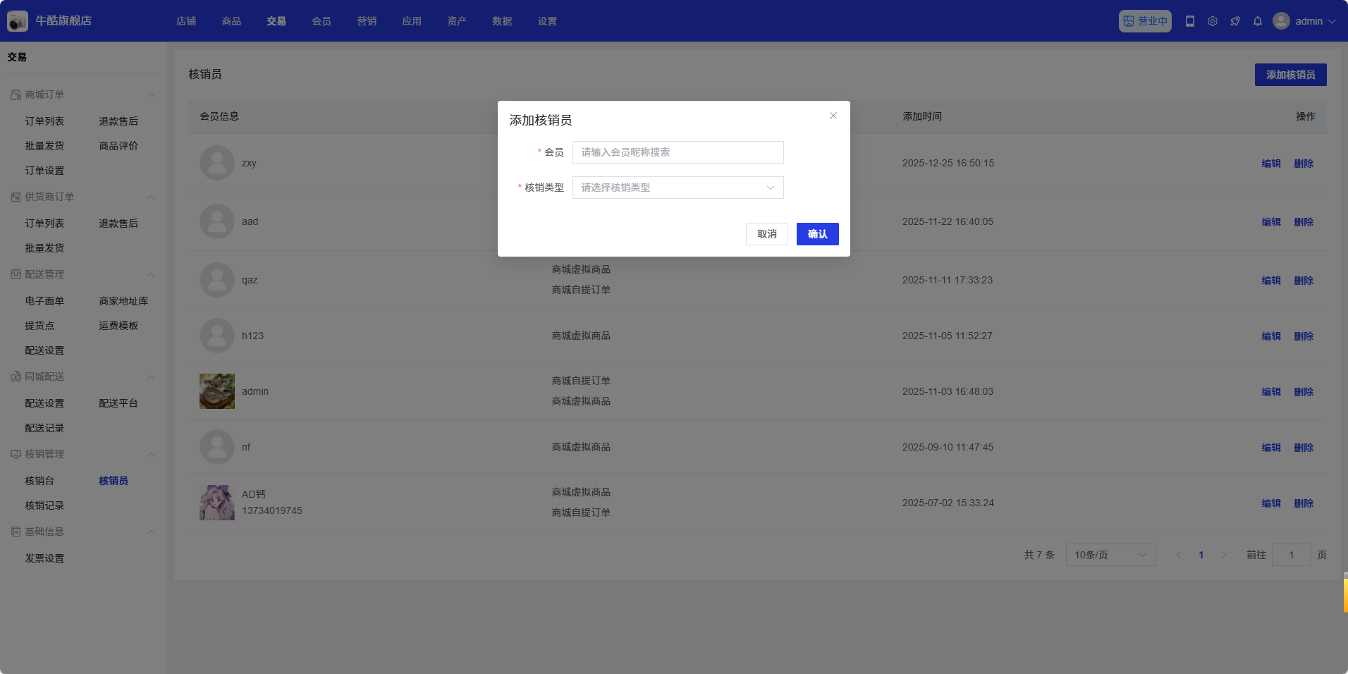核销员管理用于配置与管理拥有核销权限的会员账号,可指定不同核销员可处理的核销类型,实现权限精细化管控。