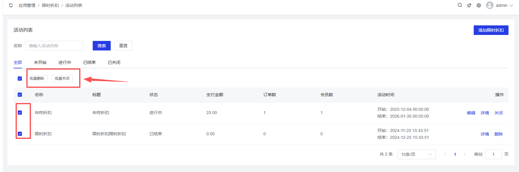 - 批量关闭:选中多个限时折扣活动,点击【批量关闭】按钮,批量关闭选中的限时折扣活动