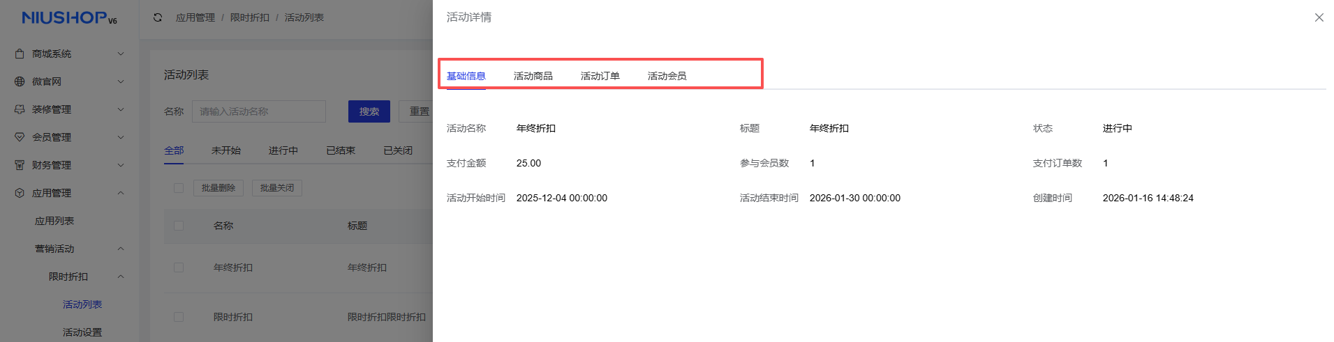 点击【详情】按钮,即可查看当前折扣活动的详细信息,包括基础信息、活动商品、活动订单等信息