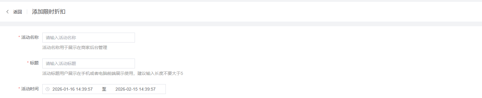 - 活动名称: 设置本次活动的名称,用于展示在商家后台管理,不会展示在前台