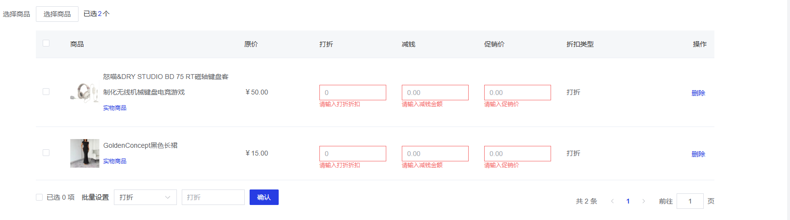 支持勾选多个商品进行批量设置折扣类型