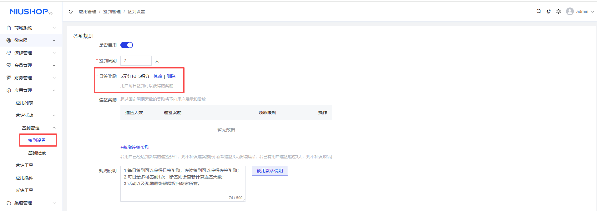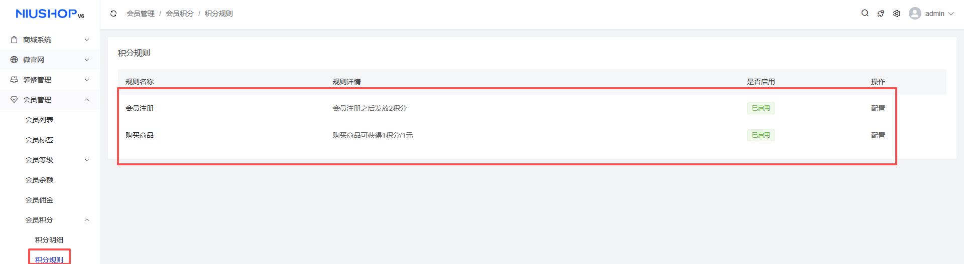 - 会员注册和购物回馈:在会员积分-积分规则页面可设置会员注册积分和购物回馈积分。