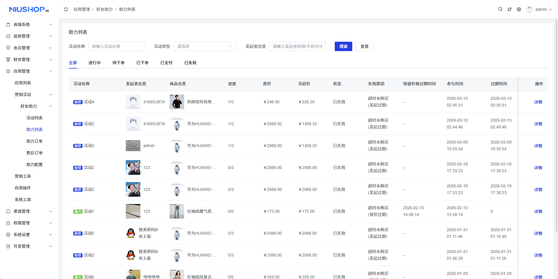 助力列表页面用于查看和管理所有用户发起的助力活动记录,支持搜索筛选、状态查看等功能。