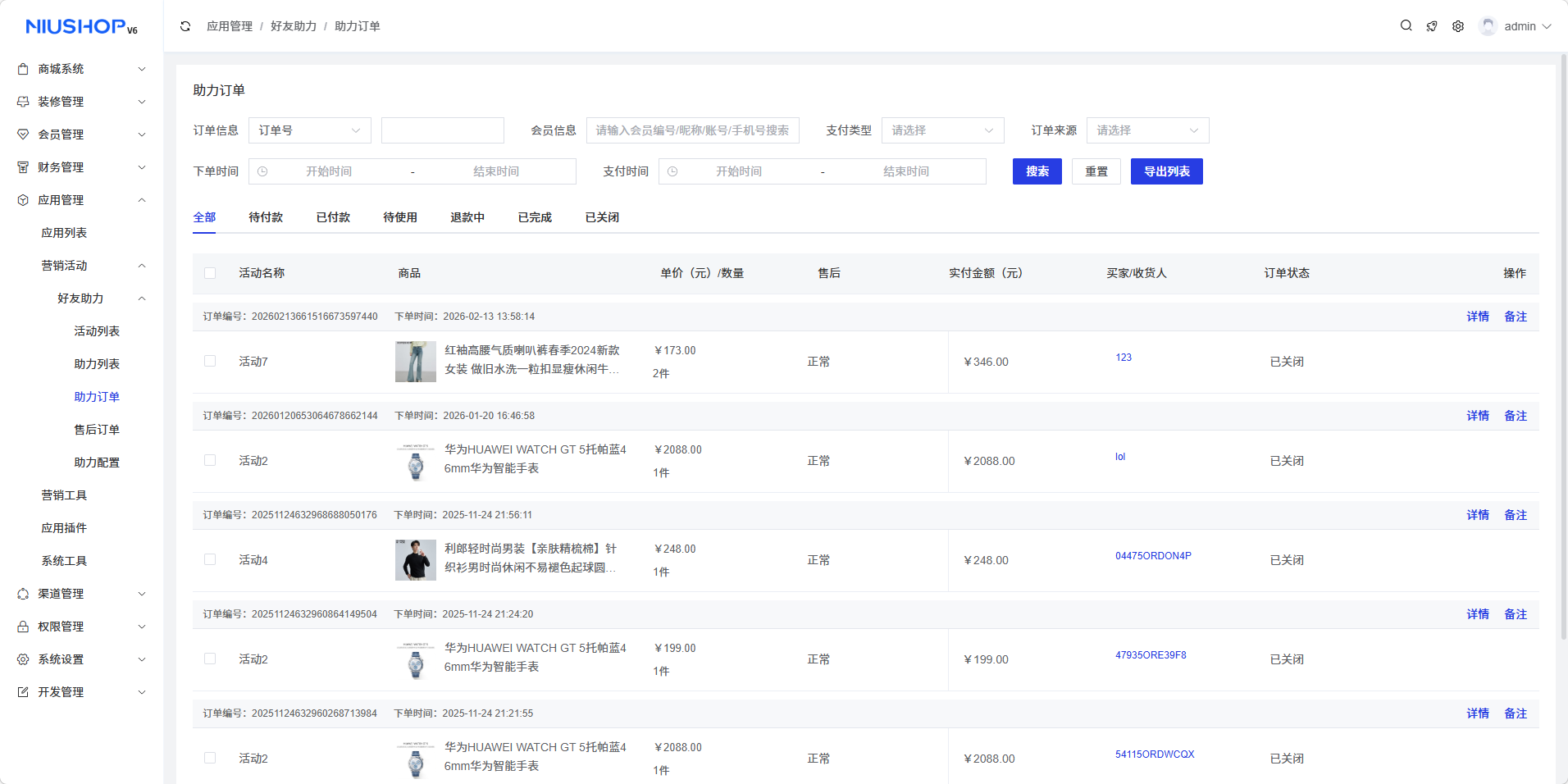 助力订单页面用于查看和管理所有通过助力活动生成的订单记录,支持搜索筛选、状态查看和订单操作等功能。