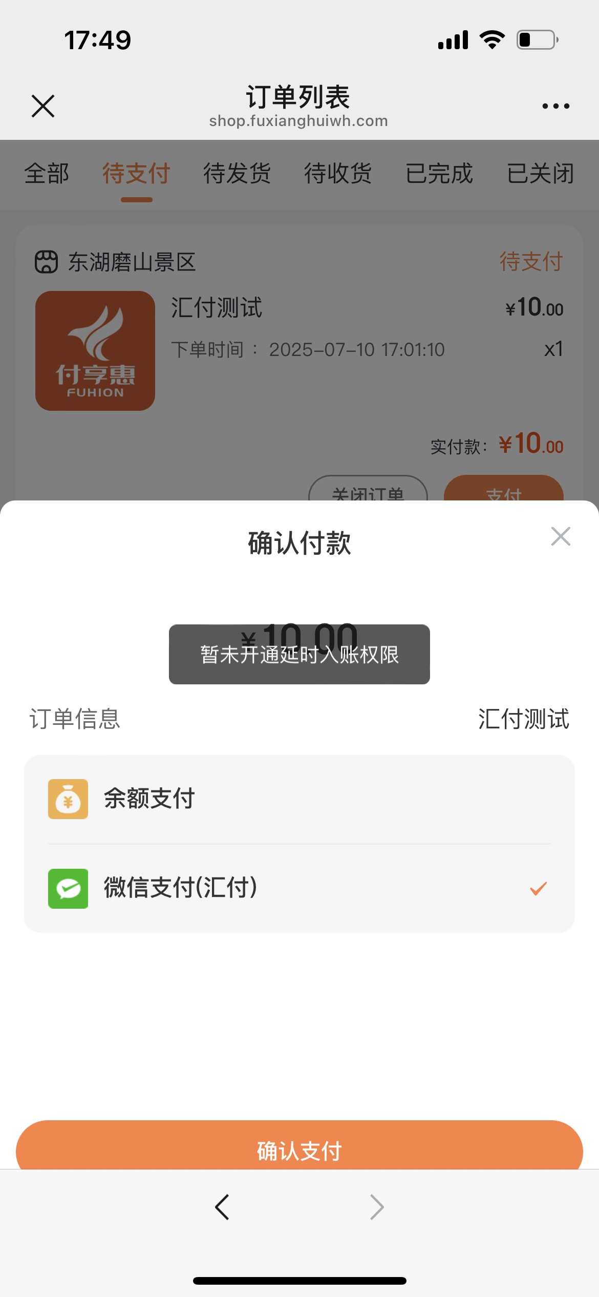 有的小伙伴使用汇付支付会提示“暂未开通延时入账权限”,该如何处理: