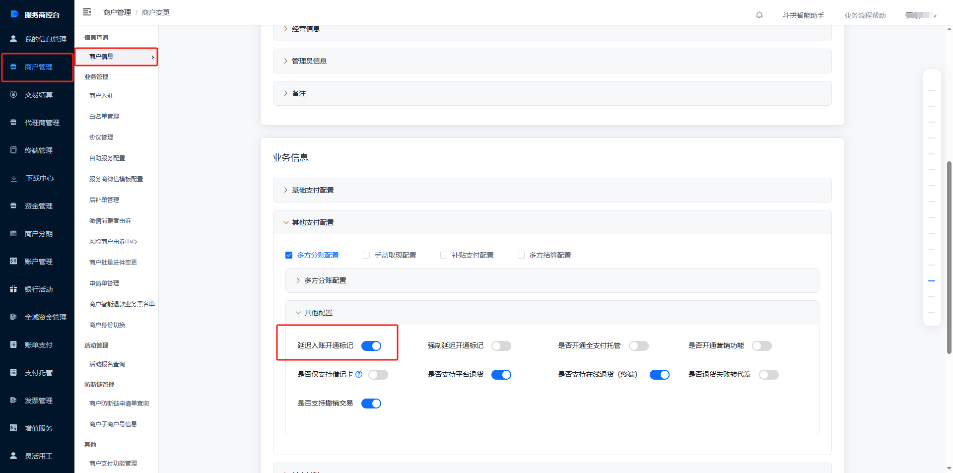 在下方其他配置中,开启延迟入账开通标记即可