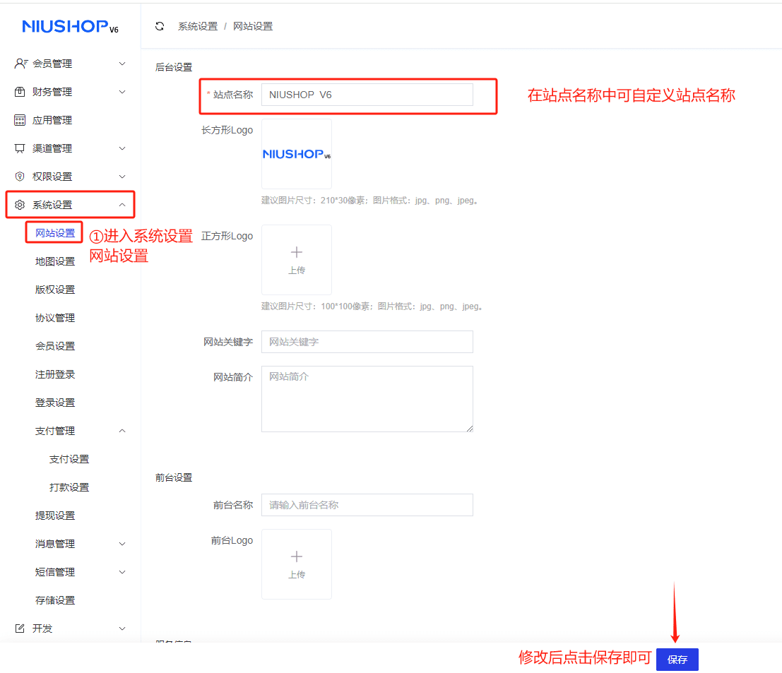 1.进入系统设置,点击网站设置,在站点名称中可自定义站点名称,编辑后点击保存即可