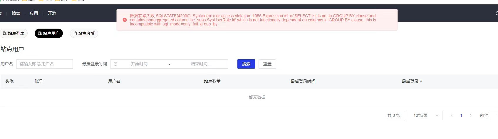 > 数据获取失败:SQLSTATE[42000]: Syntax error or access violation: 1055 Expression #1 of SELECT list is not in GROUP BY clause and contains nonaggregated column nc _saas.SysUserRole.id' which is not functionally dependent on columns in GROUP BY clause; this is incompatible with sql_mode=only_full_group_by