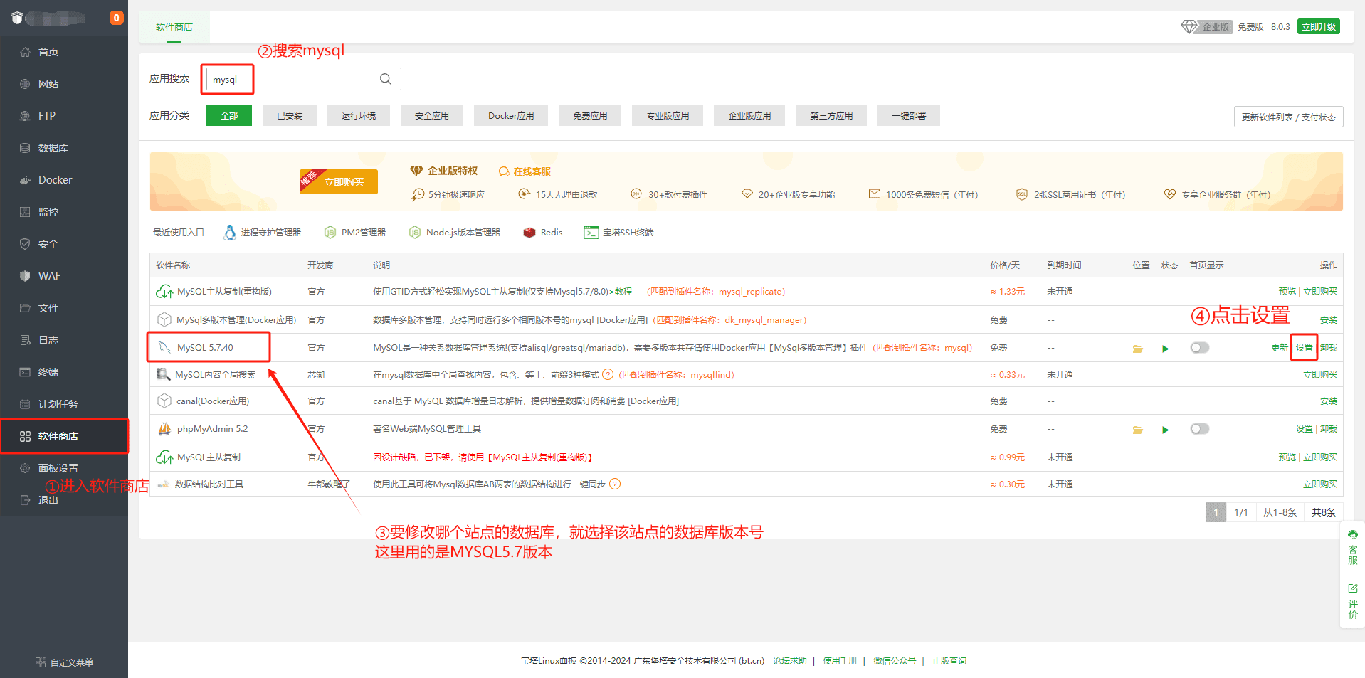 1.在宝塔侧边栏选择软件商店,搜索mysql,选中相应的数据库,点击设置