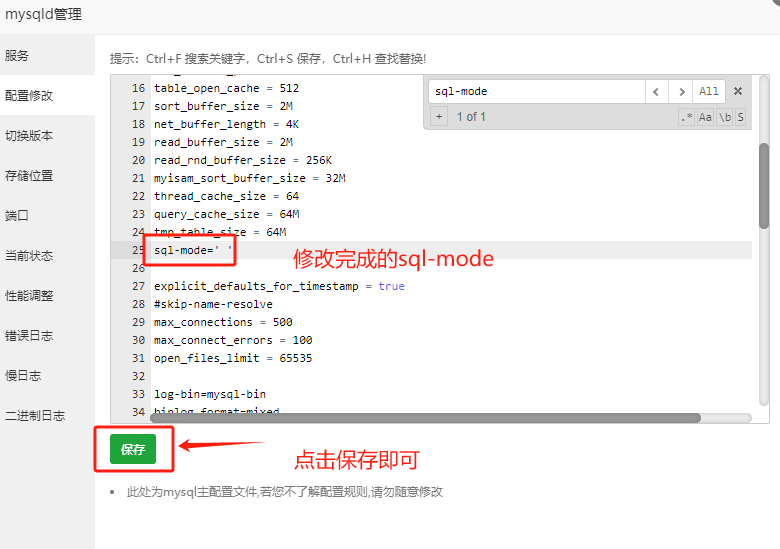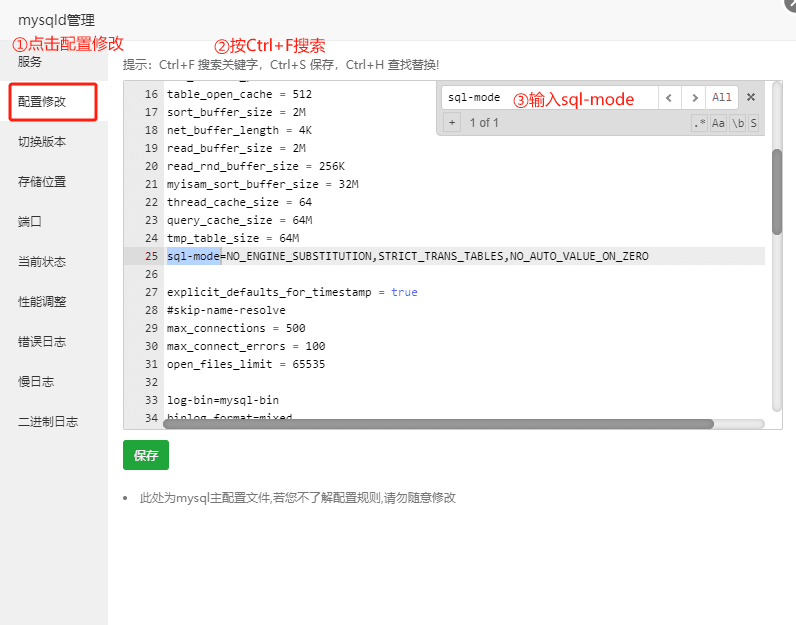 2.点击配置修改,按住Ctrl+F键搜索sql-mode(注意:有点显示的是sql_mode,有点显示的是sql-mode两者都可以)