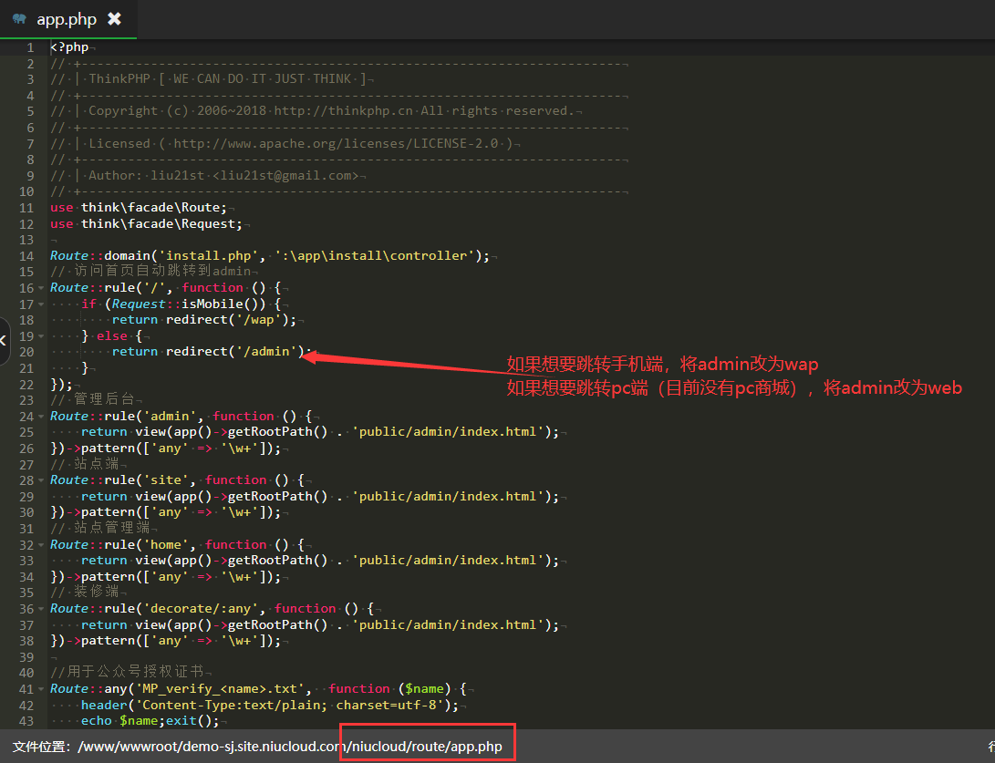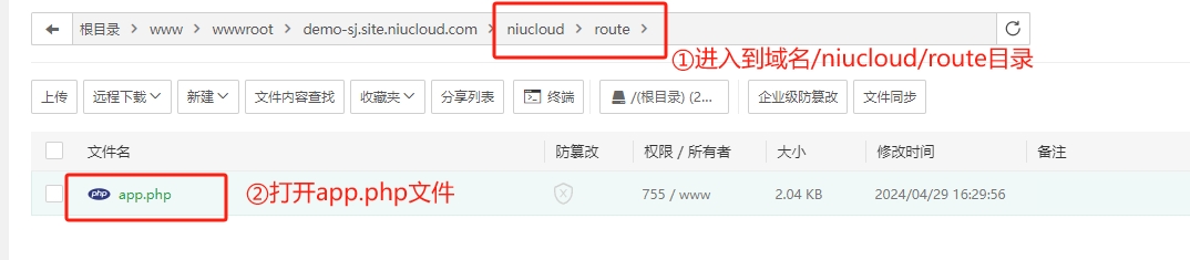 2.进入到域名/niucloud/route目录,打开app.php文件