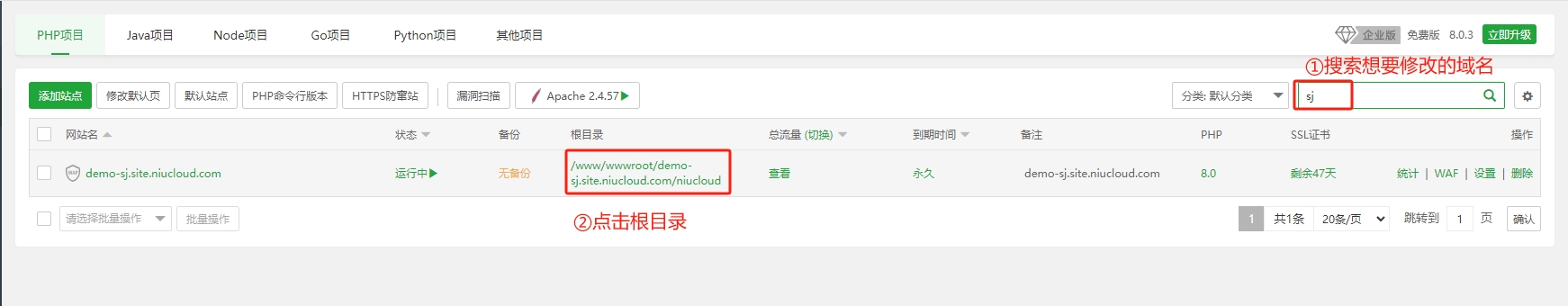 1.打开宝塔linux面板,搜索想要修改的域名,搜索后,点击要修改的域名根目录