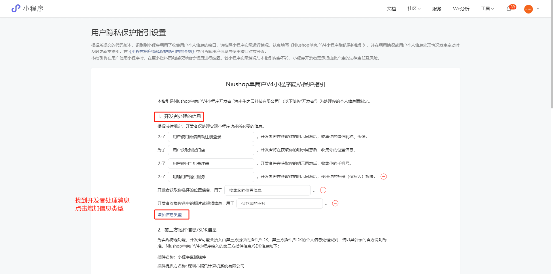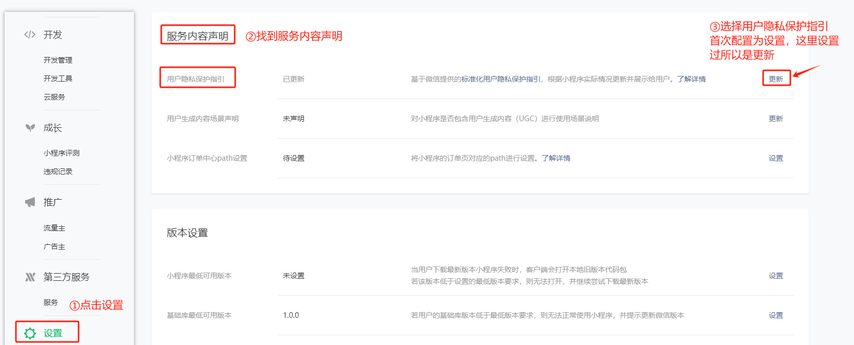 1.登录微信小程序平台,侧边栏点击设置,找到服务内容声明,选择用户隐私保护指引,点击设置/更新
