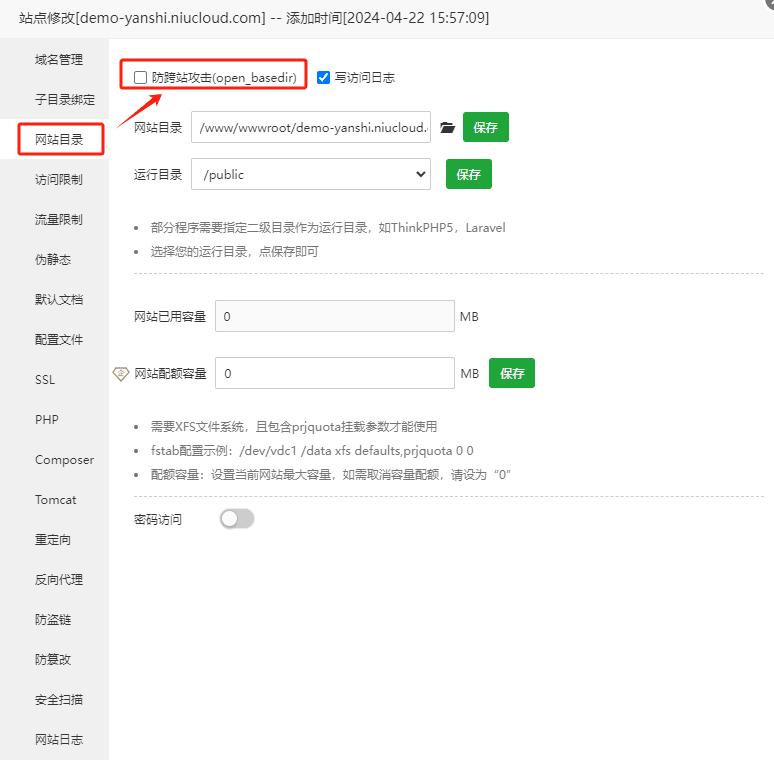 6.单击网站目录--取消勾选防跨站攻击(防止访问域名时候报错is_dir(open_basedir()) )