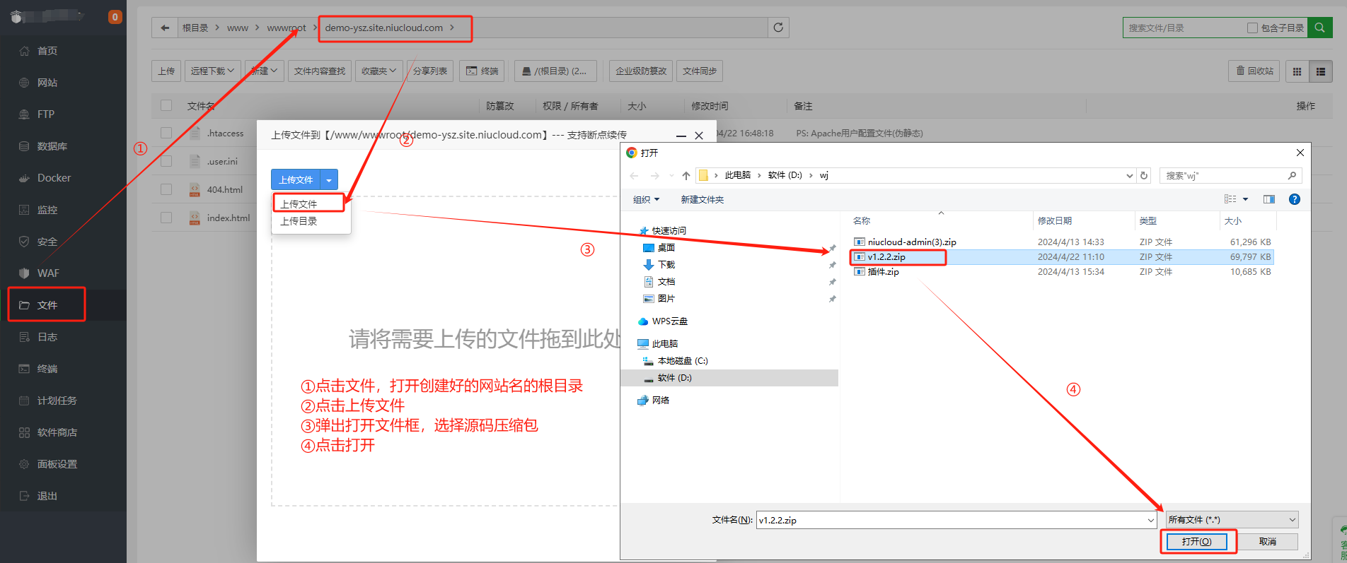3.网站创建成功后点击根目录,上传源码。解压后将文件内容放到站点根目录下