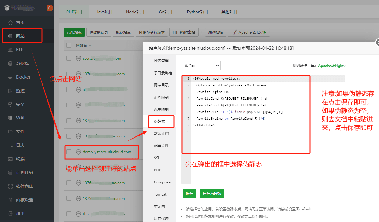 注意:如果伪静态存在点击保存即可,如果伪静态为空则去文档中粘贴进来,点击保存即可