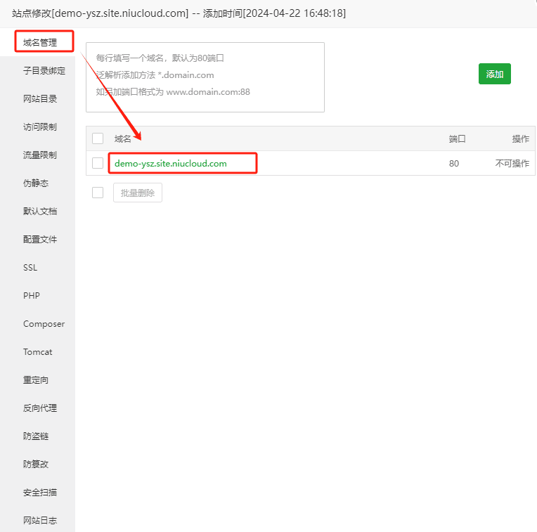 1.添加站点。点击左侧菜单“*网站→添加站点”