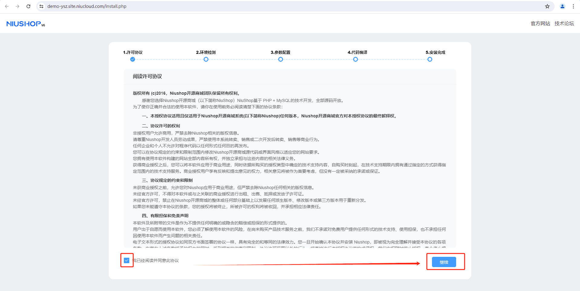 2.勾选协议,点击继续