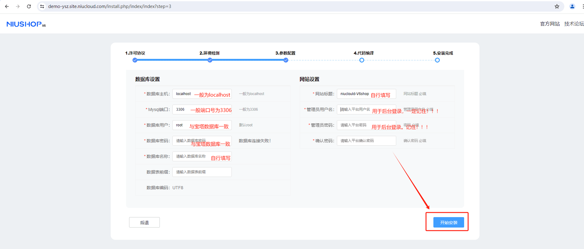 3.填写数据库配置和网站配置