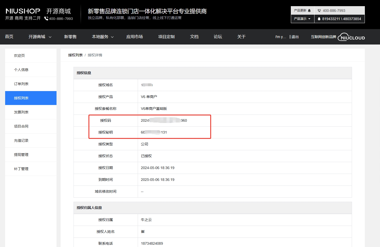 温馨提示:授权码的位置在:如果购买v6产品的在www.niushop.com查找,如果购买是saas版,在www.niucloud.com中查找,点击个人主页,进入授权列表,选择购买的套餐,点击查看详情
