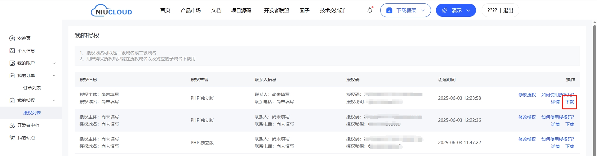 进入我的主页,选择我的授权,授权列表,下载源码