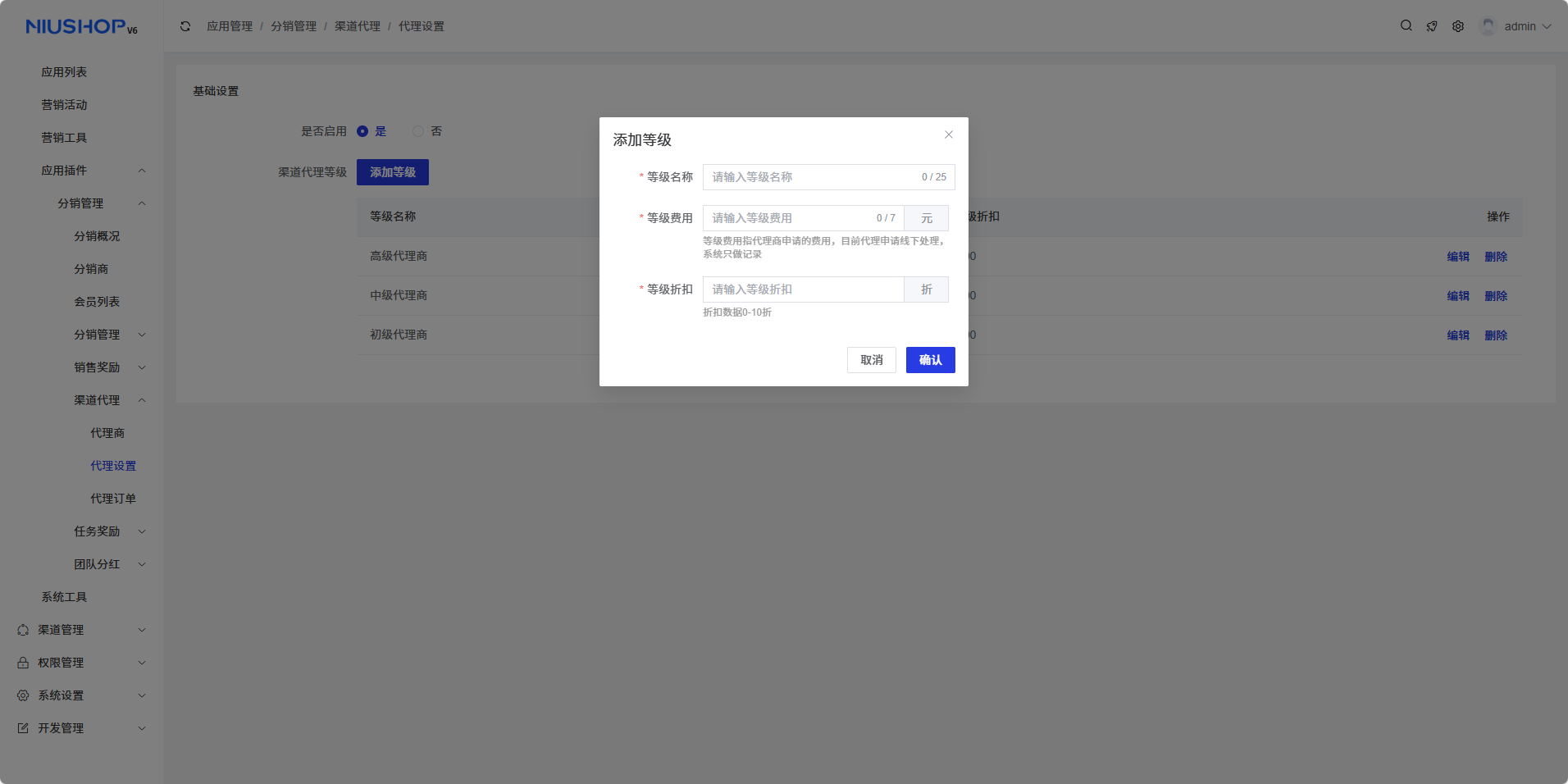 - 等级名称:输入代理商等级的名称
