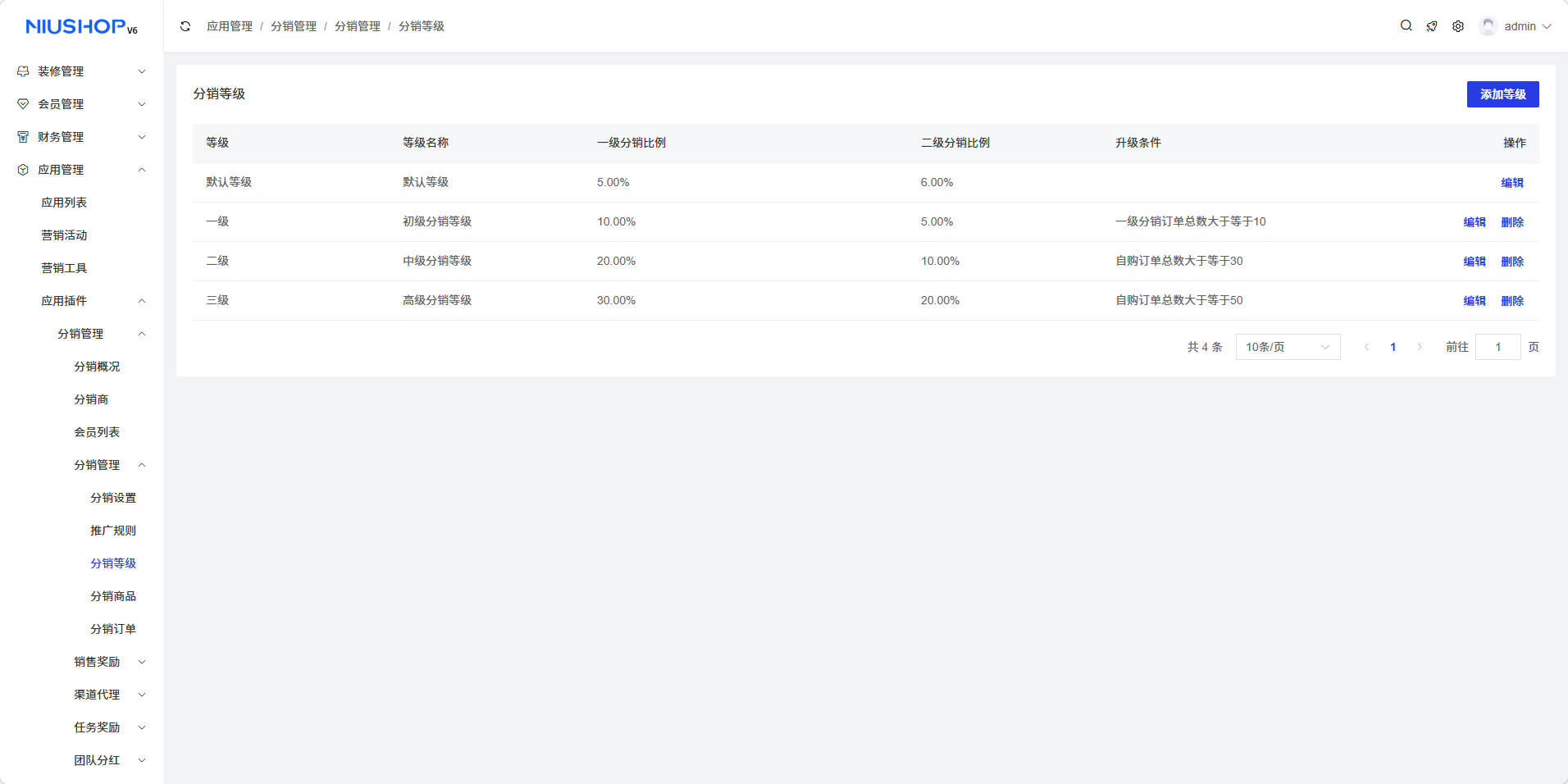 分销等级页面用于管理分销商的等级设置,包括等级名称、分销比例和升级条件等配置,帮助管理员建立完善的分销商等级体系。