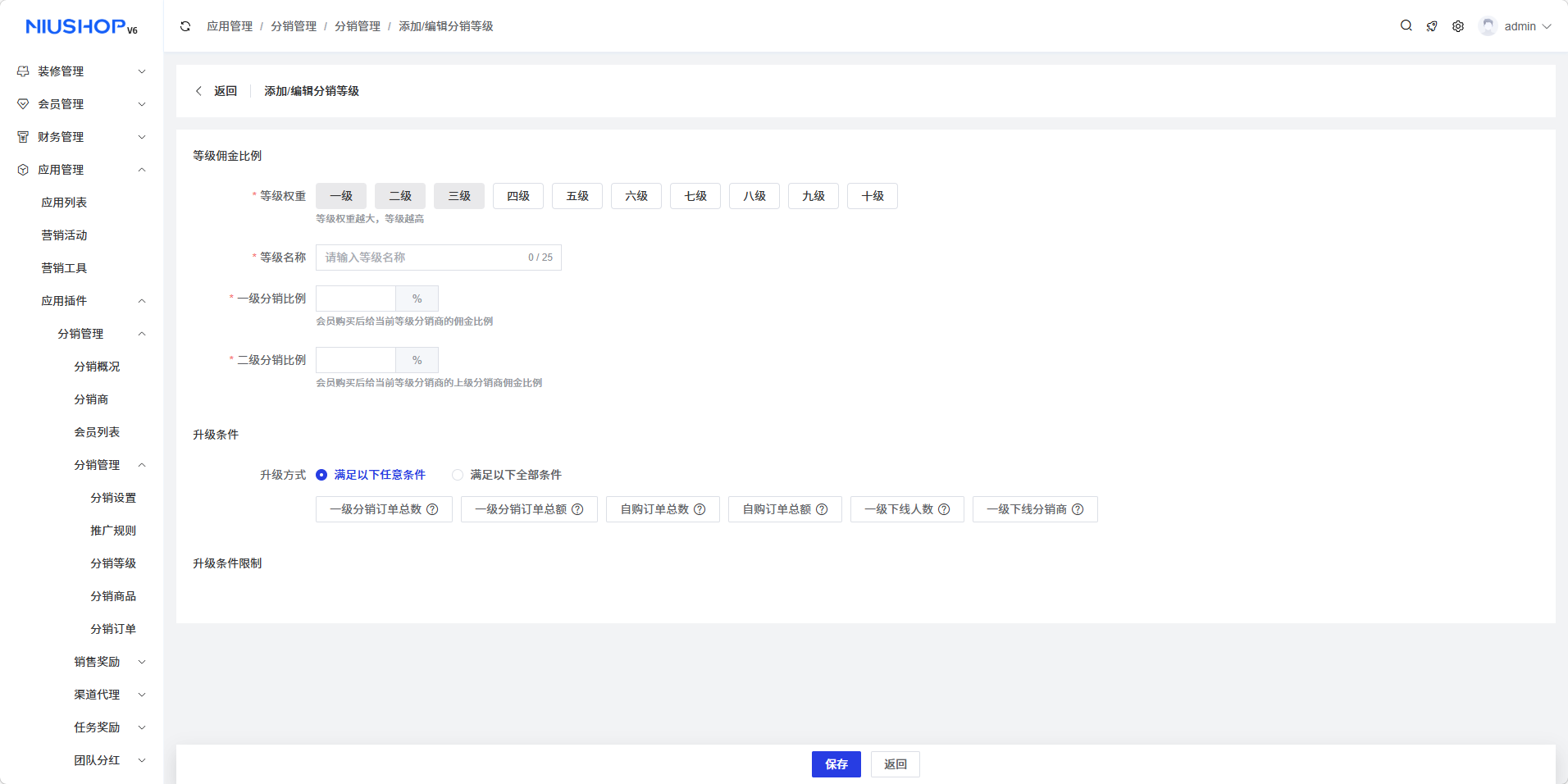 - 升级条件:显示分销商升级到该等级需要满足的条件