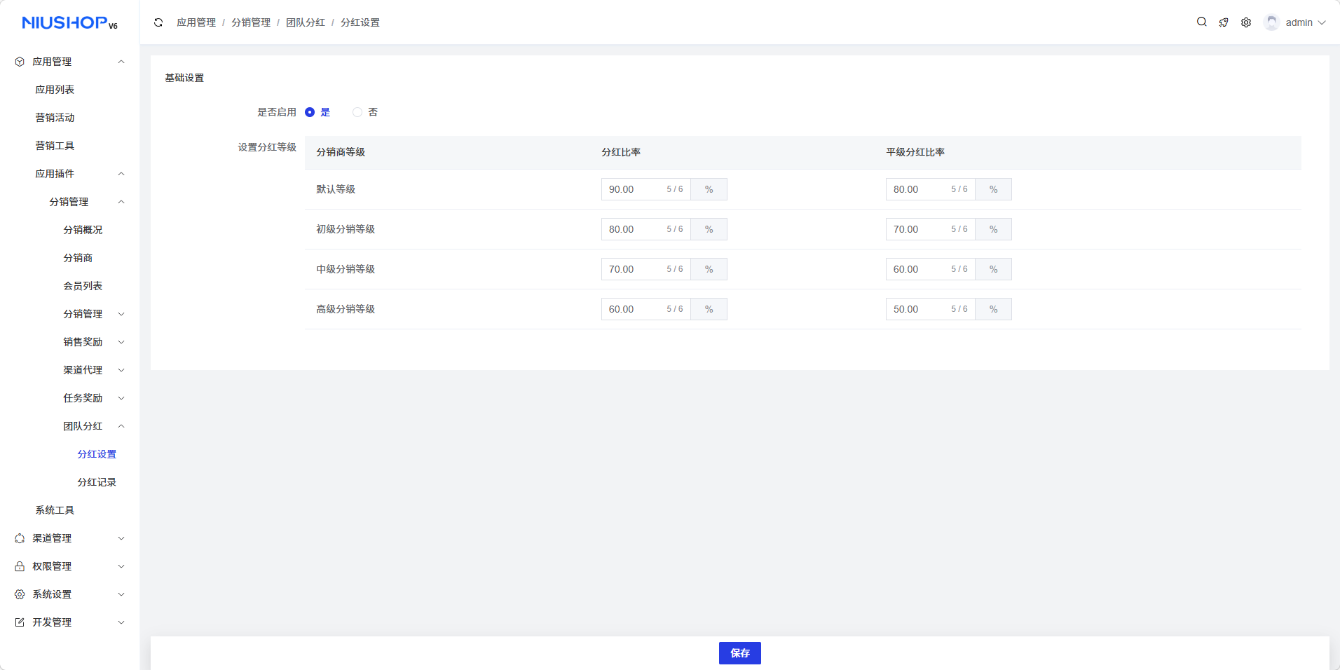 - 分红比率:设置该等级分销商获得的直接分红比率