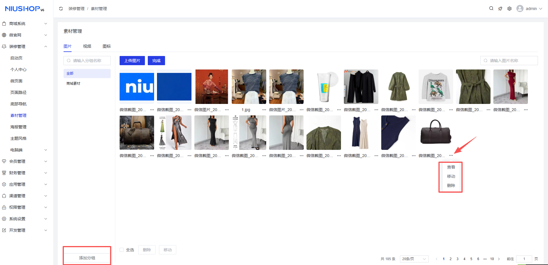 素材管理这里存放着上传后的图片/视频的所有内容,可点击编辑选择图片的下的...或者选择快速点击图片/视频内容可进行查看移动删除,也可以在此处添加分组方便管理图片。