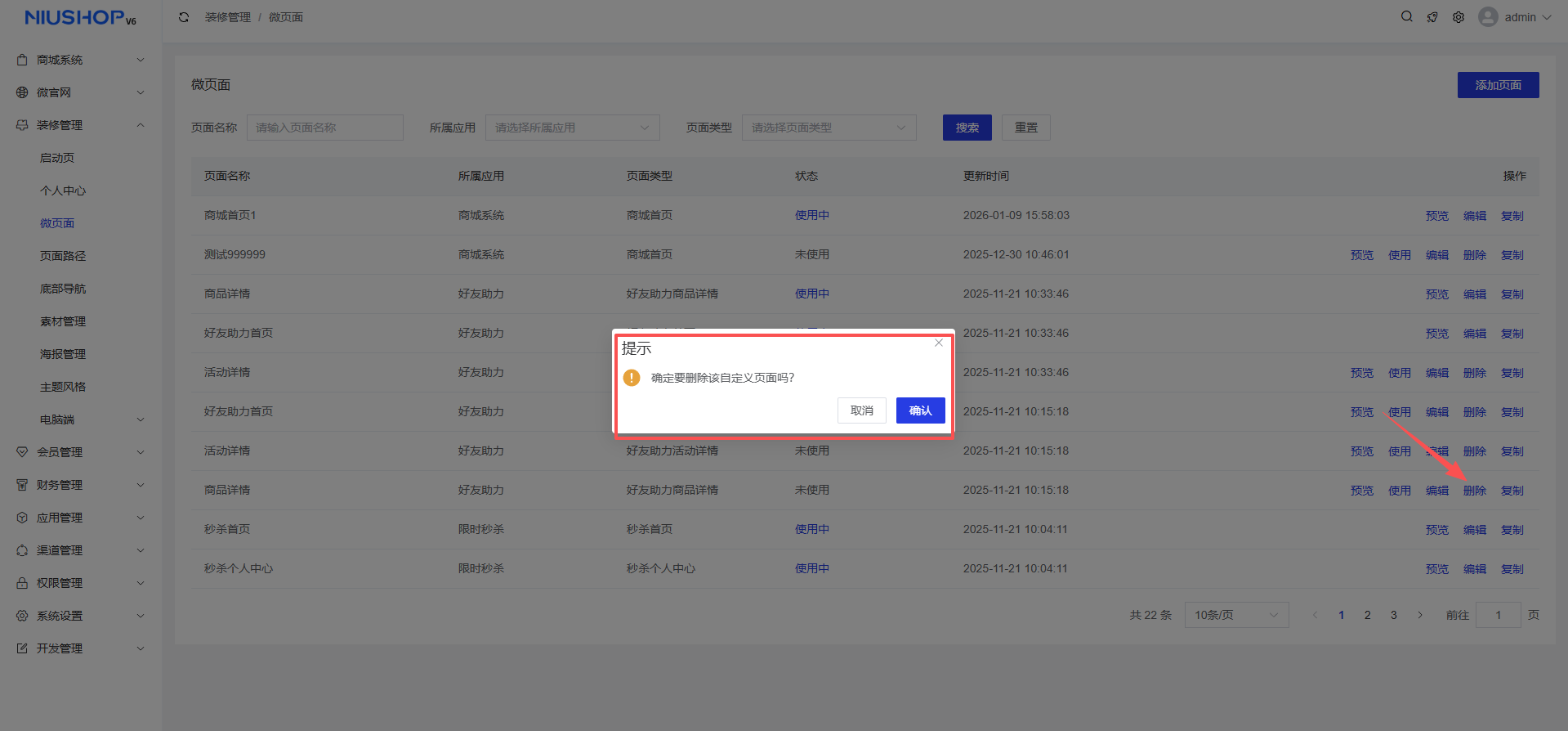 选择未使用的微页面,点击删除,弹出提示框,点击确认即可删除成功。