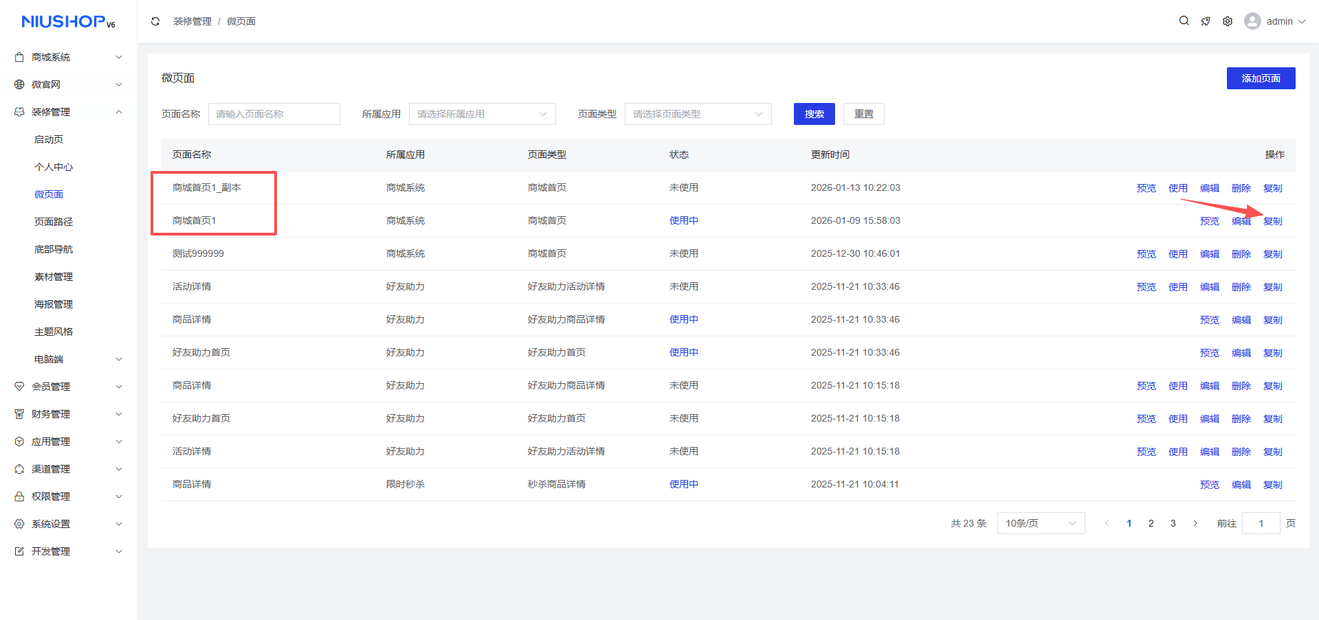 5.复制 点击复制,可创建一个新的相同微页面,新页面的名称会在原名称后添加“副本”字样,且新页面的状态为未使用。