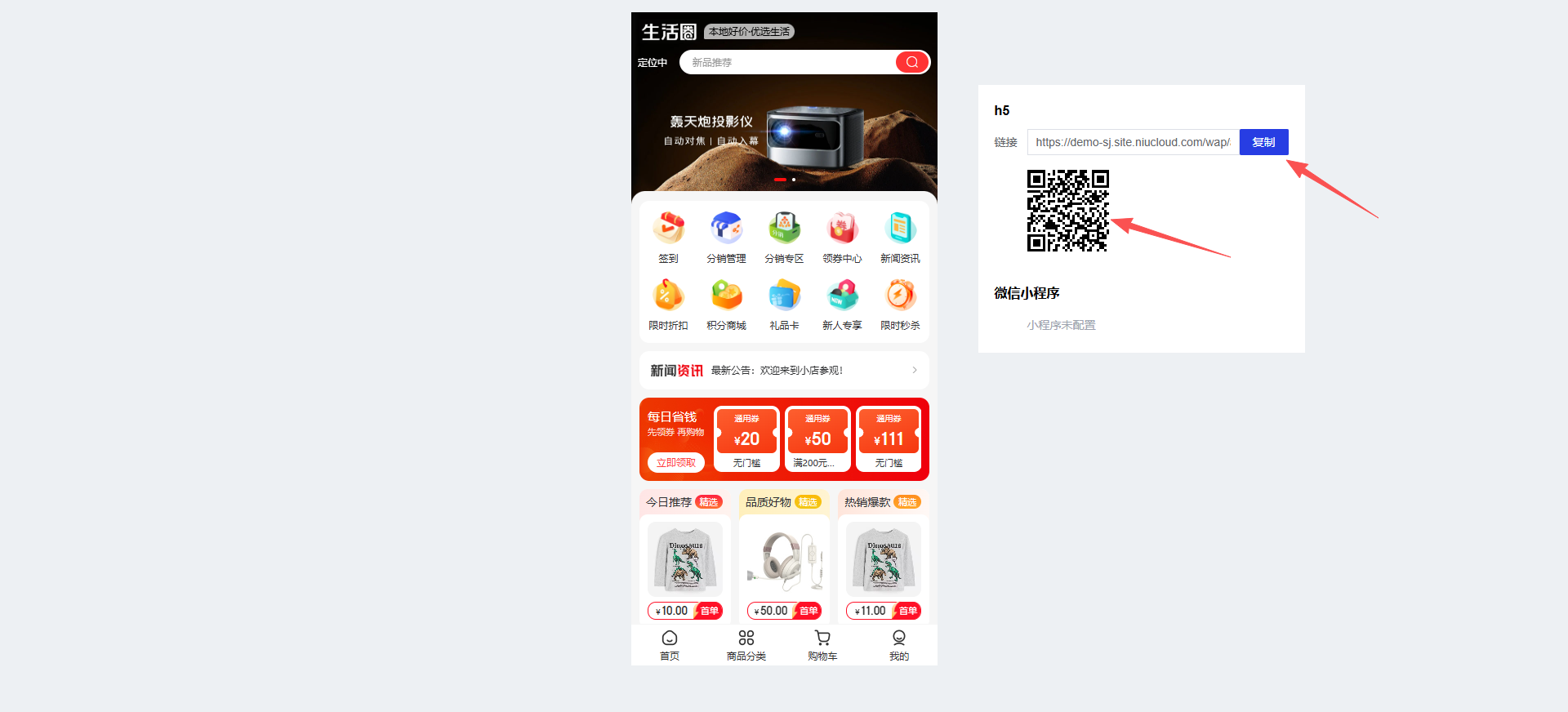 点击预览可快速预览微页面内容,也可以通过复制链接、扫描二维码等用手机来浏览微页面。