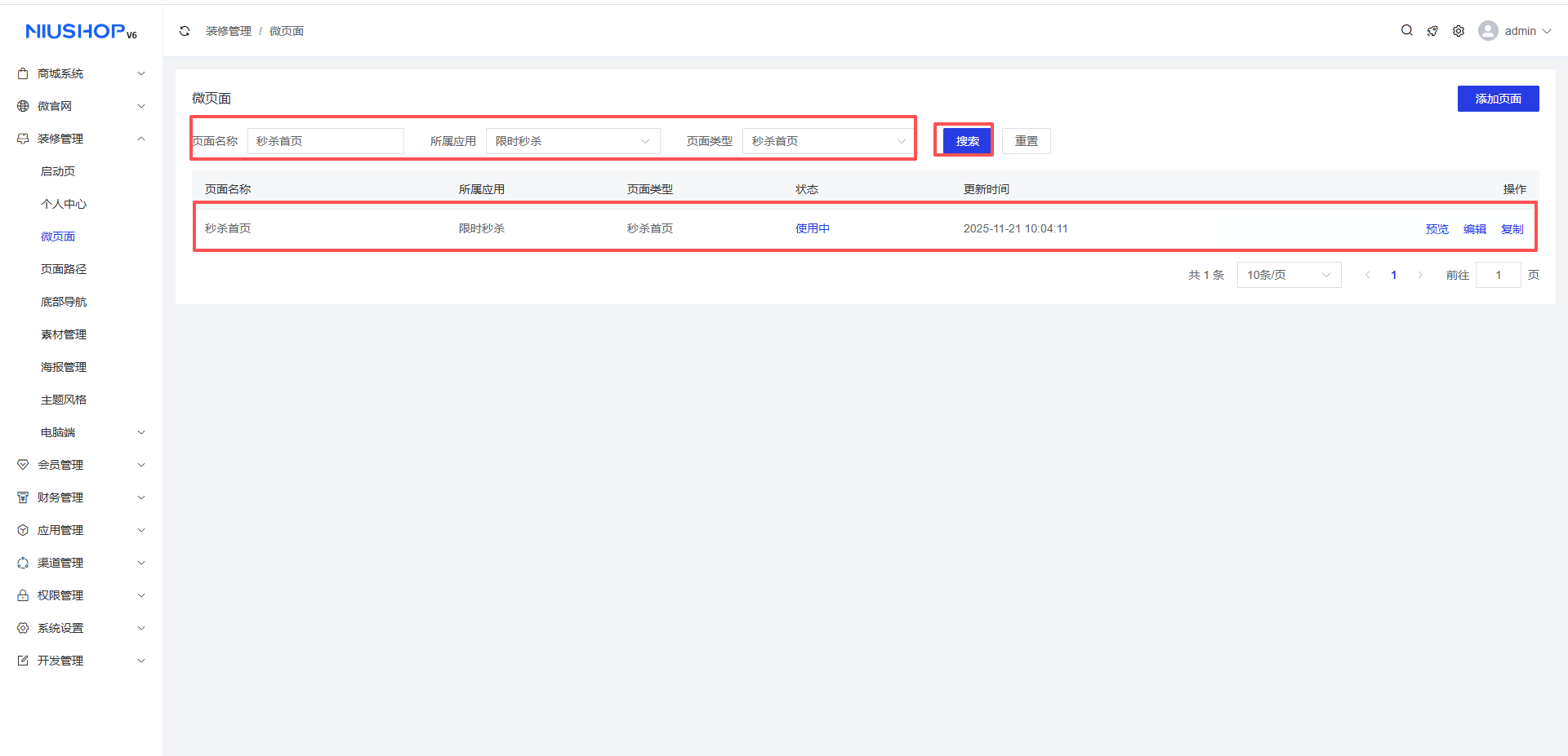 可直接输入页面名称/所属应用/页面类型来快速筛选微页面内容。