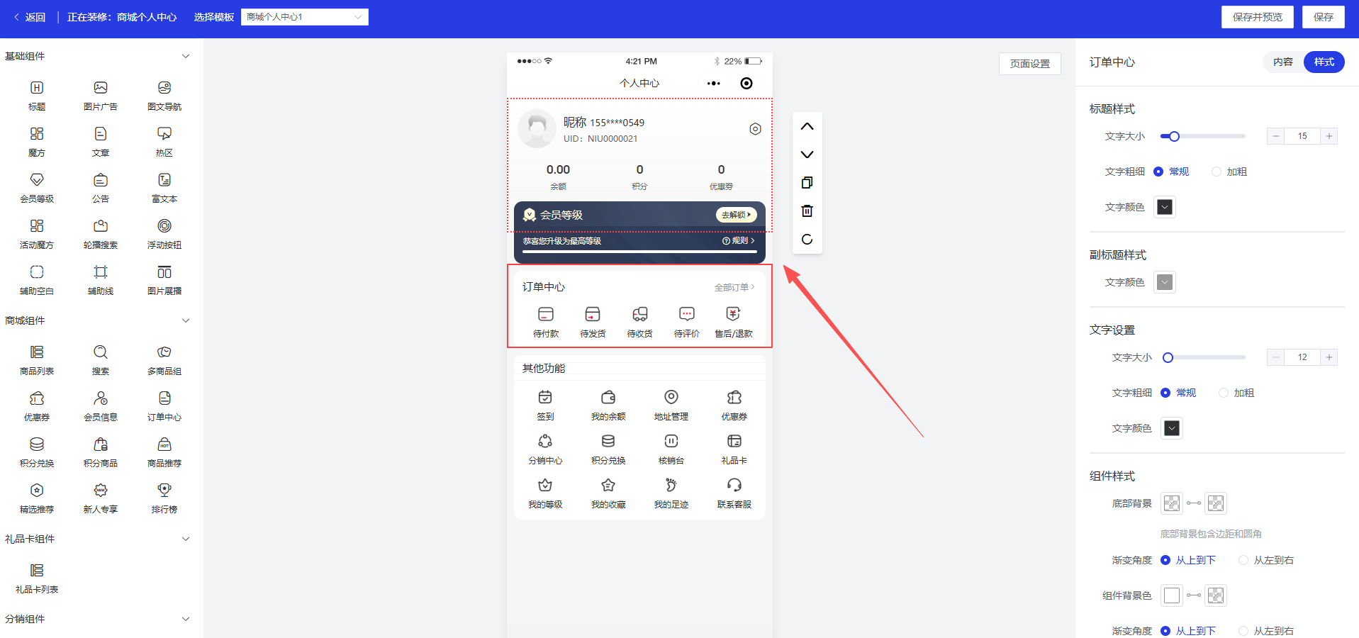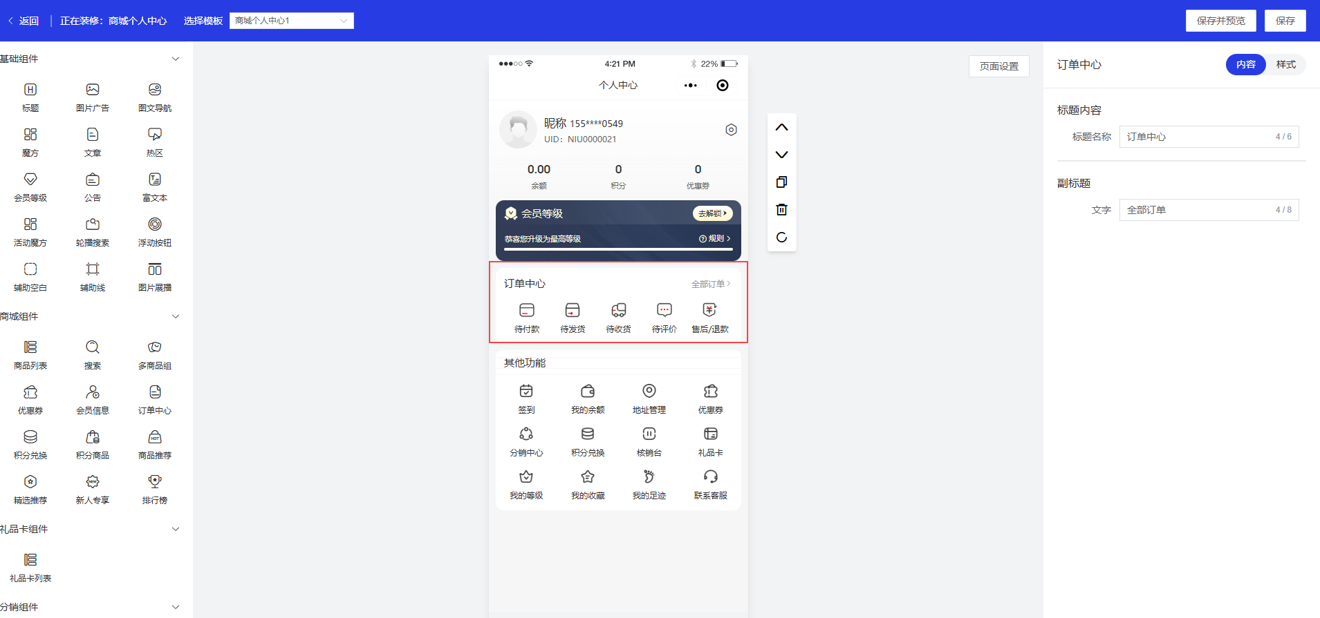 商城组件中的会员信息和订单中心各只允许添加一个。