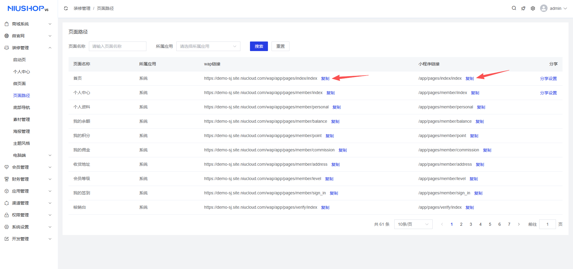 页面路径可查看wap链接,小程序的链接,为装修时创建跳转链接时可直接复制跳转链接,提供便利操作。