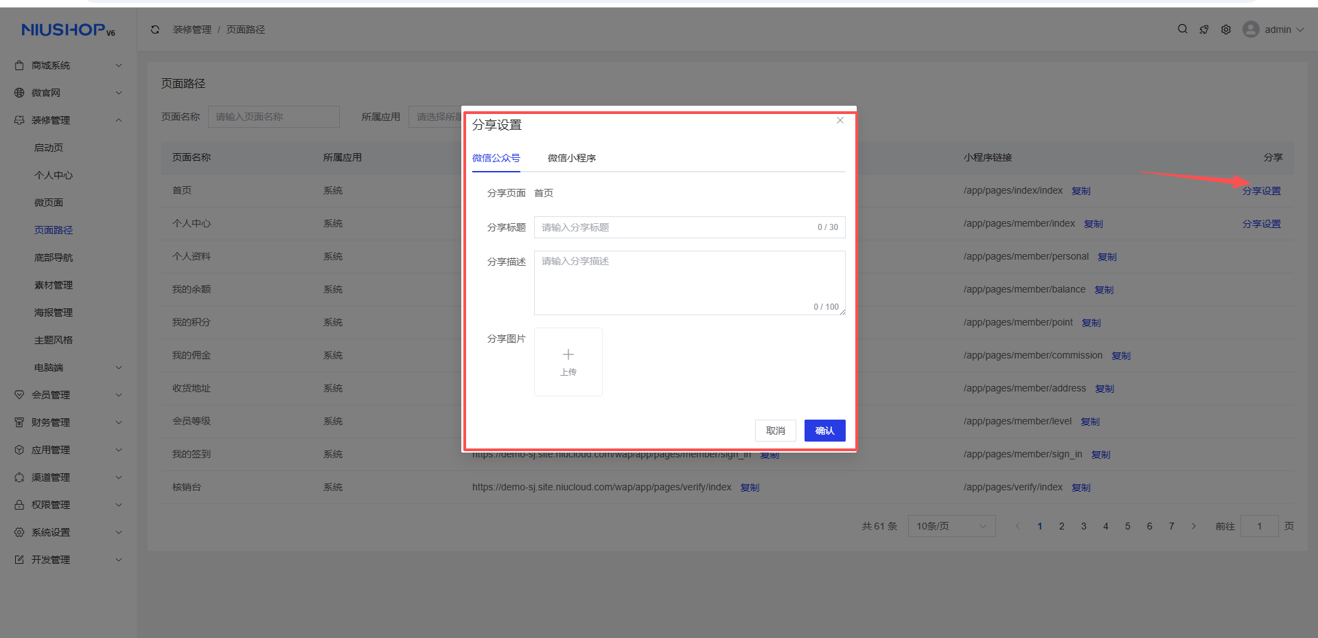 可对页面名称,所属应用来进行快速筛选页面路径内容,点击分享设置可以对微信公众号/微信小程序进行分享设置。