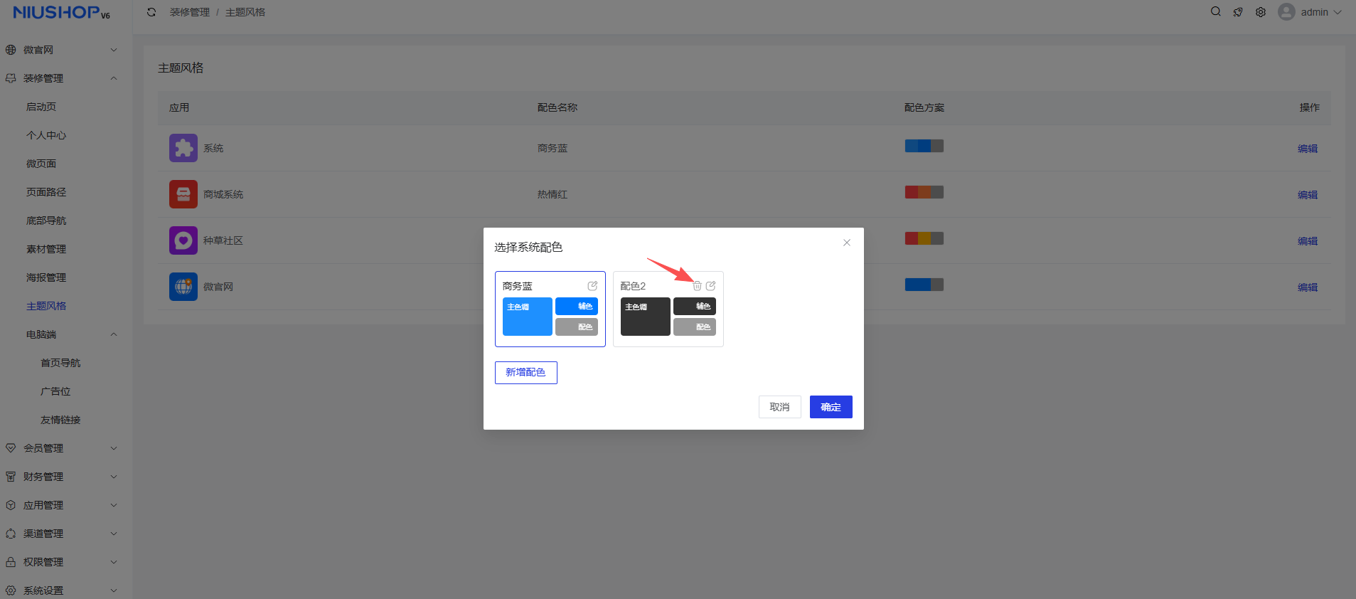 点击编辑,选择已存在的配色,点击删除按钮,即可删除该配色。