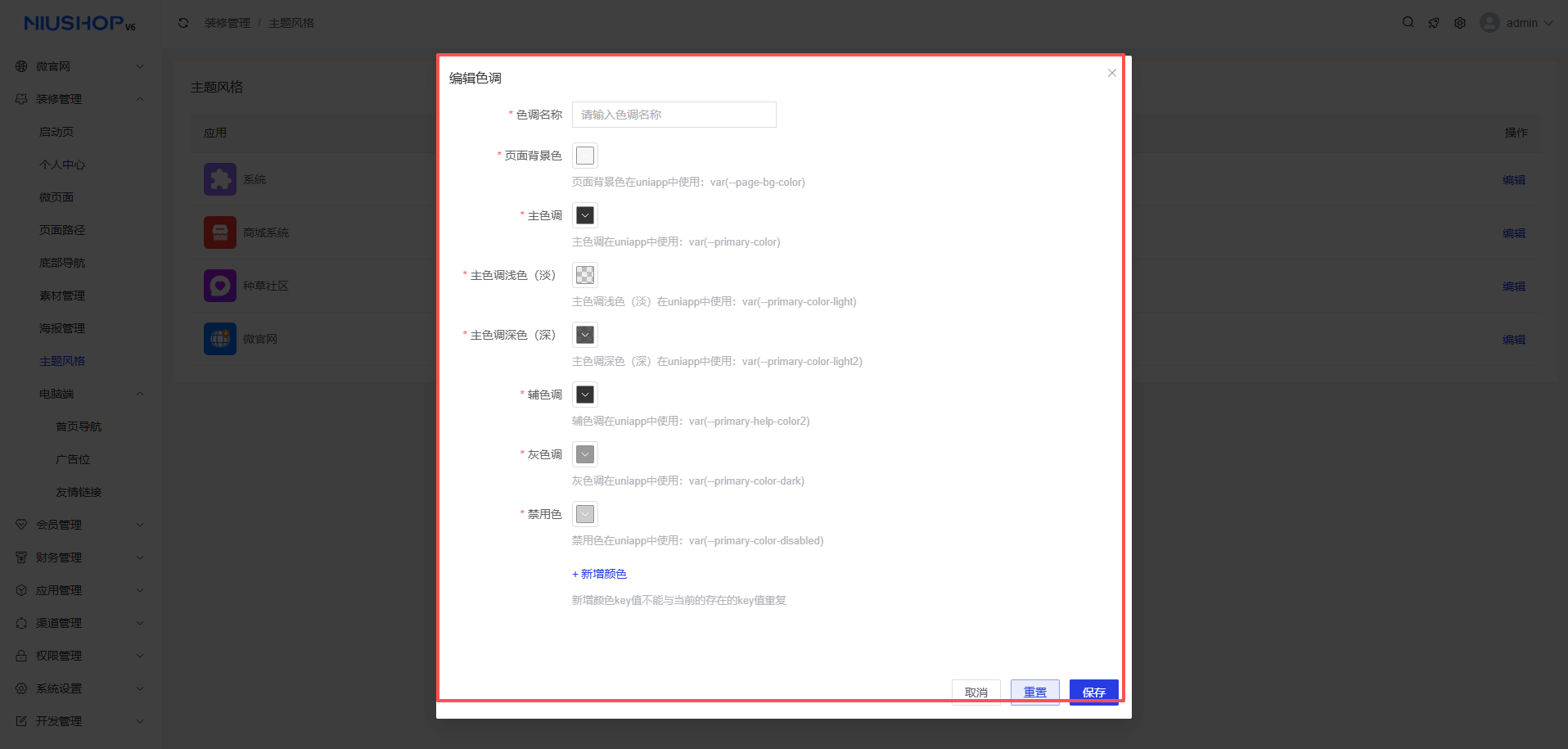 点击编辑,选择新增配色,填写色调名称、页面背景色、主色调等信息。