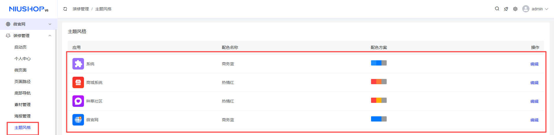 主题风格支持用户根据不同的应用场景,自定义进行配色。目前支持以下应用:系统/商城系统/种草社区/微官网,